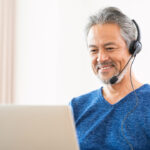 有線ヘッドセットを使い、リラックスした表情でパソコンに向かってAI音声入力(思考のダンプ)を行う50代男性のイメージ写真。