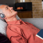 ソファでヘッドホンをつけ、本を手にしながらリラックスして音声学習をする50代男性